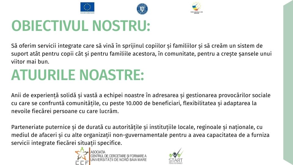 Astfel, plecand de la aceasta realitate sociala, am stabilit ca OBIECTIV GENERAL al proiectului ”cresterea accesului la servicii specializate a copiilor din Maramures care au parintii plecati in strainatatea si care se fla in risc de separare de familie”.