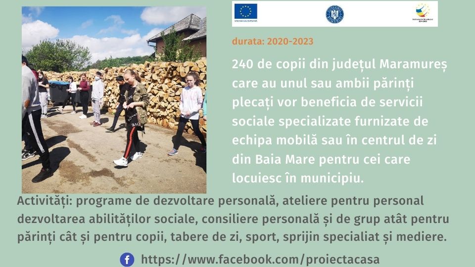 Proiectul „Acasă – asistarea copiilor care au părinți plecați la muncă în străinătate pentru atenuarea riscului de separare de familie”, cofinanțat prin Programul Operațional Capital Uman (contract: POCU/476/4/18/130363) al cărui beneficiar este Asociația Centrul de Cercetare și Formare a Universității de Nord Baia Mare în parteneriat cu Asociația Start Pentru Performanță, se adresează în mod direct acestei categorii de copii, a copiilor lăsați acasă.